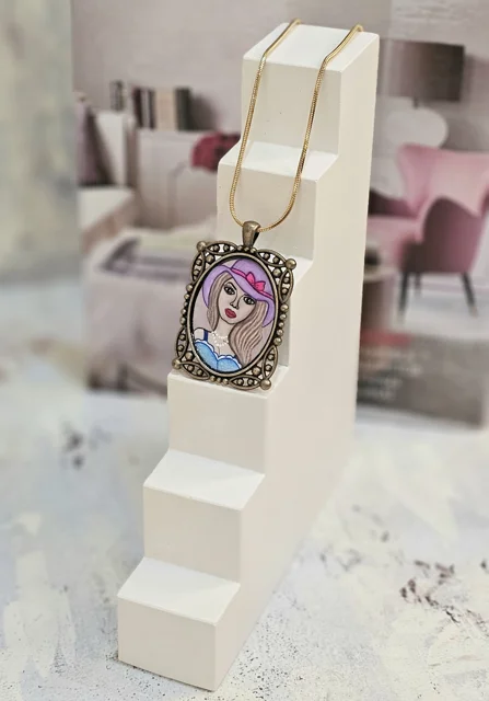 گردن آویزمیناکاری شده(طرح دختری با چشم های درشت،کلاه نارنجی و پیراهن صورتی رنگ)