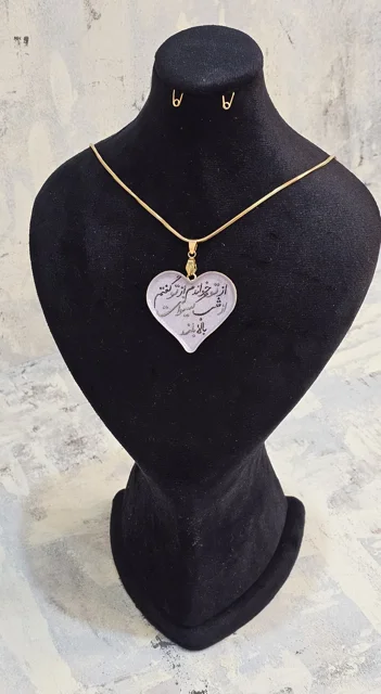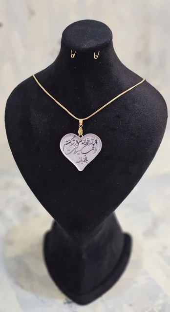 گردن آویزی از جنس برنج آبکاری شده با ابعاد۳×۳/۷ سانتی متر( با شعر: از تو گفتم،از تو خواندم،از شب بالا بلند گیسوانت) که خطاطی با رنگ های مخصوص روی آن انجام شده است. طول زنجیر ۶۰ سانتی متر است. پشت کار،با رنگ طلایی اکلیلی،رنگ شده است.