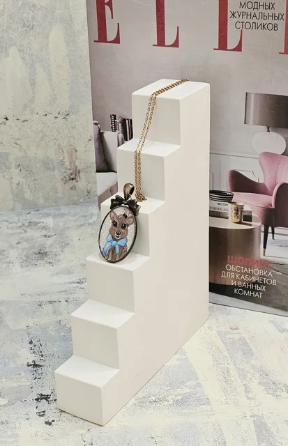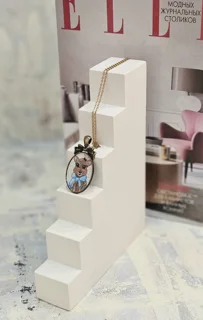 گردن آویزی از جنس برنز با ابعاد۲/۵×۴ سانتی متر که طراحی دستی(صفر تا صد کار،طراحی با دست است) با رنگ های مخصوص روی آن انجام شده است.